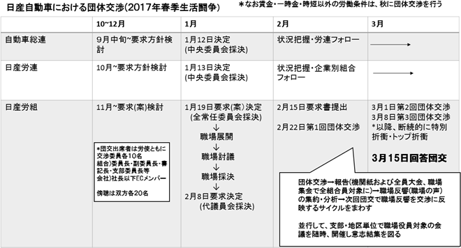 次に団体交渉。これは日産自動車における団体交渉、具体的には今年の春季生活闘争を簡単にパターン化したものです。自動車総連、日産労連、日産労組と階層化しています。もちろんナショナル・センターである連合が大きな方針、大枠の考え方は出すんですけれども、実際の要求案などは、産業別組織以下で作っていきます。これはもう見た通りです。それぞれ毎年秋くらいから論議を始める。1つ注目していただきたいのは、要求案を検討する際に、上部団体といいますか、例えば、日産労組では日産労連の方針作成に参加している。さらに日産労連は自動車総連の方針決定に参加している。自動車総連は連合の方針決定に参加するという形で、企業別労働組合の意見というものをナショナルセンター・レベルまで繋げるような仕組みになっているということをご理解いただきたい。どのようにして賃金の要求をしているかというと、これはすさまじい分析をやるわけです。企業連レベルも単位組合も。世界経済、日本経済、物価動向、雇用情勢、それから組合員の生活実態を知るためにアンケート調査をやったり。それで一体どういったところを論点にしながら今年は要求を組むかということを本当に真剣に論議しながら決めている。それも幹部だけで勝手に決めるんじゃなくて、職場の中の討議の積み上げで決めています。