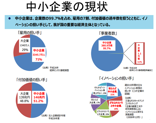 次に、日本の中小企業の現状です。日本の労働者の7割が、中小企業で働いています。具体的には、中小企業で3300万人以上の方が働いています。下の図の右上にある事業者数を見ていただくとわかりますが、日本の企業の99%が、実は中小企業です。TVやインターネットを見ていても、大企業の宣伝が多いですよね。中小企業の現状というものが、メディアなどではなかなか出てこないのですが、日本の経済の主体として、付加価値やイノベーションの多くの部分を中小企業が担っていることが分かると思います。