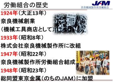93年前に会社ができたときには、労働組合はありませんでした。これはどこの労働組合も会社も同じだと思います。ここで奈良機械製作所労働組合の歴史を少し紹介しますが、何せ70年前のことなので、当時組合員だった人は今はいませんので、書物とか記憶とか又聞きなどで調べたことを紹介します。会社が1924年にできて、1933年(昭和8年)に株式会社になりました。その後、昭和22年、終戦から2年後に奈良機械製作所の労働組合は結成された。戦後の混乱期ということで、激しいインフレが起き、そのあとデフレ政策がとられ、経済的にも混乱を極めた時代だったそうです。労働者の生活は非常に厳しく、この時期に労働組合もかなりできたらしいのですが、大変な苦労があったことと思います。その後、昭和23年、1948年に総同盟東京金属という上部団体、今のJAMに加盟しました。
