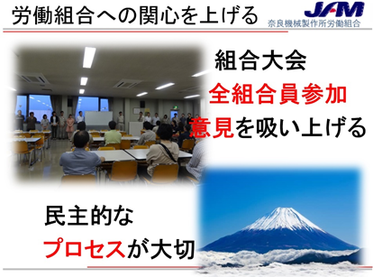 富士山の絵を映しましたけど、富士山を登る方法としては、普通はバスか車で5合目までいって、頂上まで歩いて登っていくという方法があります。あるいはヘリコプターで一気に頂上に行ってしまうようなやり方とか、1合目から歩いて行くという登り方もあります。様々な方法がありますが、全ての組合員が組合活動に参加して、民主的なプロセスで方針や考えをまとめて活動する。この進め方、プロセスが大事であり、この進め方ができるというのが労働組合のある中小企業のメリットだと、改めて感じています。