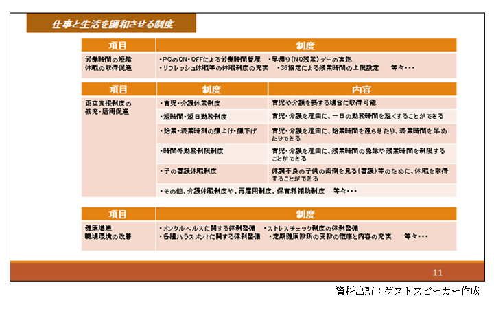 人生の中には様々な出来事が起こりますが、自分自身の能力を発揮して働き続けることができる会社であれば、会社としても超少子高齢化社会が到来している日本において労働力の確保に繋がり、会社の生産性向上に繋がっていく。こういう循環があるので、ワーク・ライフ・バランスは必要であり、働く側だけではなく会社側もきちんとワーク・ライフ・バランスについて考えなければならないと思います。