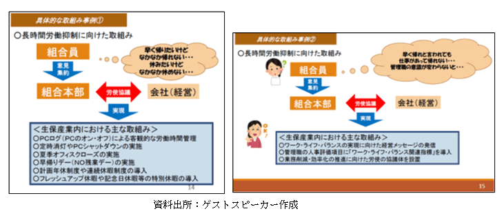 ここからは、参考までにこれまで労働組合が会社と協議して改善してきたことを事例として掲載しました。皆さんが気になっている長時間労働の抑制というのは、事例の①、②で掲載していますけれども、これは後日、この講座でも取り上げられると思いますので、参考までに下の図をご覧いただければと思います。