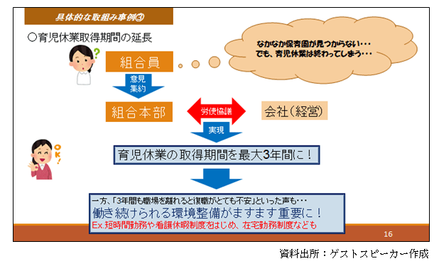 しかしながら、いくら制度が充実していてもその制度を利用できる環境になければ宝の持ち腐れです。制度が整うと両立しやすくなるのは事実ですけれども、上司や同僚に必要以上に気を遣うなど、肩身の狭い思いをすることがなくならないと本来の意味での両立支援ではありません。自分が置かれている状況に合わせて制度をうまく活用し、仕事と生活を両立していくためには、上司や同僚の理解、仕事量の調整などの環境整備が必要になりますし、そのためには、経営トップが率先垂範して環境整備を進めることが必要であり、組合員、従業員に、それを周知するためのメッセージの発信も重要になってきます。先ほどの組合員の声にあったように、「プライベートも充実させたいけれども仕事が終わらない。」のであれば、労働組合は業務削減や効率化に向けた取り組みを会社に求め、会社はそれに応えていかなければいけません。旧態然とした長時間労働が「美徳」と思っているような管理職には人事評価の項目に長時間労働の削減を導入して、それほど勤務管理というのは大事なことなのだと理解してもらわなければいけません。「仕事はしたいけれど育児も大変」と思っている組合員がいるのであれば、必要な制度を活用できるように労働組合が率先して職場の意識改革を行うことも役割の1つだと思います。