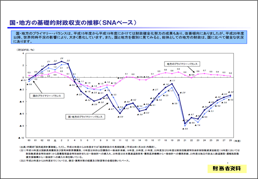 次は、国と地方の基礎的財政収支(プライマリー・バランス)の推移を下図で示します。