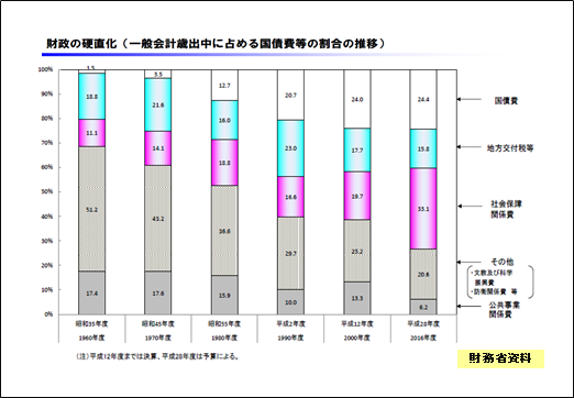 財政の硬直化(一般会計歳出に占める国債費等の割合の推移)については、直近のデータを下図で例示していますが、その原因としては社会保障関係費の影響が大きいことがわかります。少子高齢社会と言われて久しいですが、最近の新聞で「ついに人口減少社会に入った」と報道されているとおり、死亡者数が出生数を超える時代、つまり人口が、自然増で増えていたのが、逆に減っていくという時代へと転換期にさしかかったのです。したがって、国債償還や社会保障関係費など義務的経費の割合の増大で財政の硬直化(弾力的に財政を運営できない)は避けて通れません。今は一般会計歳出に占める国債費等の割合が急激に増えているということを見ていただきたいと思います。