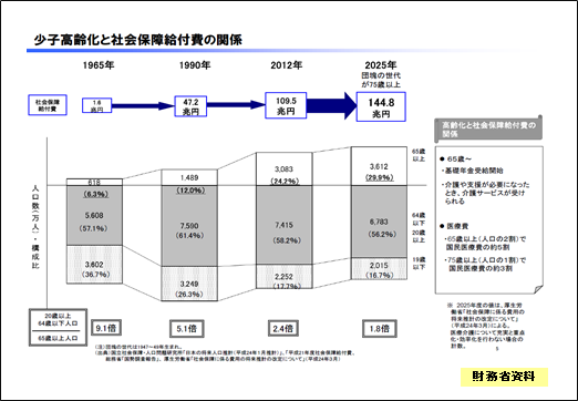 その上で、少子高齢化と社会保障給付費の関係は、下の図に1965年、1990年、2012年の数値と、2025年の推計値を示していますが、社会保障関係費が急激に伸びていることがわかると思います。高齢者が増えて若者が減少している今の日本の状況をそのまま反映して、社会保障給付費は2010年に初めて100兆円を超えました。若者とお年寄りの人口比は、元々9倍くらいあったのが、今は1.8倍しかない。20歳以上64歳未満の働いている世代1.8人で高齢者1人を支えることになりますので、相当負担がかかってくるということです。今までは社会保障を負担する側にいる大勢の稼働年齢層の方々が、一部の高齢者を支えていくという社会保障の仕組みでしたが、今後は支えていく側の人数がどんどん減ってきていっていく。そうなると稼働年齢層1人当たりが負担する社会保険料が必然的に上がっていく構造になっていきますので、非常に深刻な問題だと考えています。