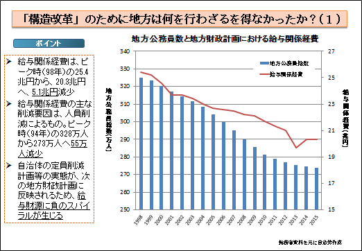 それ以外に、構造改革のために何を行わなければならなかったのか。実は東日本大震災の時だけ給与をカットしているわけではなくて、人事委員会の勧告に基づかない地方自治体独自の給与カットをずっとしているのです。