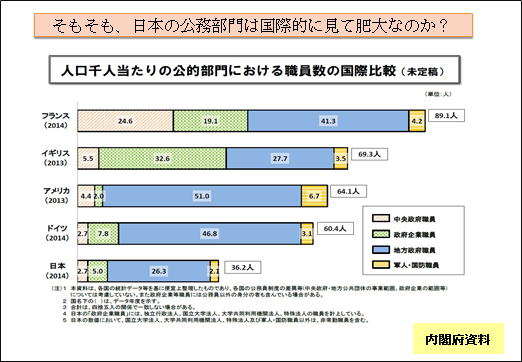 これは内閣府が野村総合研究所を通じて調査したデータです。直近の2014年のデータですが、中央政府、政府企業職員、地方政府職員、軍人・国防職員という内訳で、左から順番に記載されていますけれども、日本が1000人当たり36.2人に対し、フランスは1000人当たり89.1人、イギリスは69.3人、アメリカは64.1人です。G7というか先進国と比較してみると、日本は全然多くないし、逆に少ないといっても過言ではありません。地方公務員が多いとずっと言われ続けてきましたが、日本国内にいるとわからないのですが、国際比較すると実はそうではない。先進国のグループで比較すると、ある意味で日本は極端に少ないということをご理解いただければと思います。