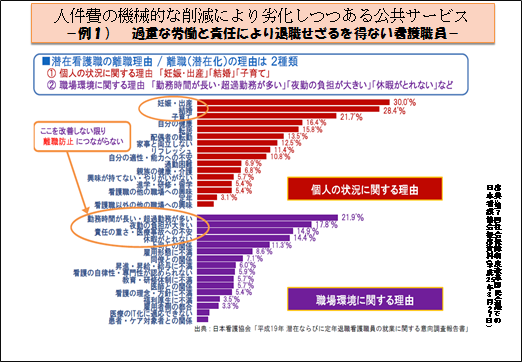 人件費の機械的な削減により劣化しつつある公共サービスの一例として、看護現場のアンケート調査結果を紹介します。