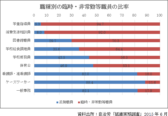 これは職種別の非正規職員の比率です。学童指導員では実に95%が非正規職員で、消費生活相談員も9割を超える方々が非正規職員です。図書館職員では約7割、学校給食調理員や用務員といった学校職場関連は約6割です。さらに、保育士や看護師、ケースワーカーなど福祉・医療関連の業務を担っている専門職にも相当数の非正規職員が働いている。非正規の方々の手助けがないと仕事が回らないのが公務部門の実態です。保育士や介護士の給与水準の問題は、働き方改革会議でも議論されていますけれども、実は保育士の半数以上が非正規で安い賃金で働いているのです。