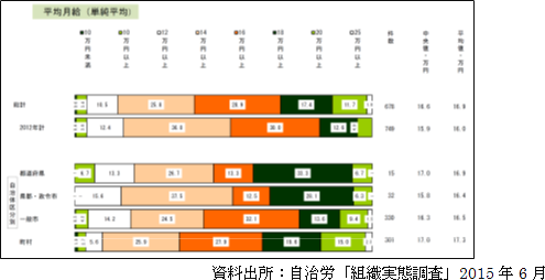 非正規職員の平均月給の分布を見ると、14万円、16万円、18万円が一番多い層です。14万円と16万円の場合、一時金がありませんので単純に12カ月で計算すると、14万円であれば168万円、16万円であれば192万円ですので、年収200万円未満に非正規職員が集中していることが読み取れます。都道府県や政令指定都市では、フルタイムで働いていて18万円を超える月給を得ている方も約3割いますけれども、市町村ではその割合が減っているということがわかっていただけると思います。