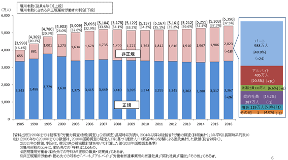 もう1つ、この非正規のなかには色んな人がいます。まず、パートタイムやアルバイトと呼ばれる短時間で働く人たちがいます。アルバイトは約400万人、パートタイムが1000万人弱。それから給料を時給ではなく月給でもらっているけれど、雇用期間を1年や半年など有期で契約している契約社員。その他、嘱託とよばれる雇用形態もあります。このように、非正規雇用といっても様々な雇用形態があります。現在も、正規雇用が約3,300万人いますので、雇用労働者の多数ではありますが、1985年と比べるとずいぶん世の中は変わってきています。