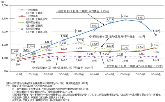 それからもう一つは賃金の問題です。次のスライドは、雇用形態別に時給ベースの賃金カーブを表しています。