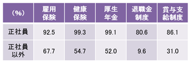 それからもう一つ、各種制度の適用状況が違うという問題もあります。退職金が一番顕著なのですが、正社員は8割の方がある一方で、正社員じゃない人は9.6%、1割もない。健康保険の加入対象にならない人も多くいます。労働時間や日数、期間等働き方が異なるということにより、色んな制度が正社員を非常に大きく下回っているという問題があります。