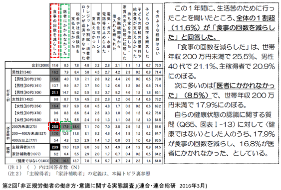 このように、正社員と非正規社員との賃金格差はかなり大きく、世帯主でも年収200万円未満といった人たちがかなり増えてきています。その結果、非正規の方は、生活苦のために、食事の回数を減らすとか、医者にかかれないといった状況に陥ってしまいます。このようなことが非常に大きな問題になっているというのが今の非正規の問題です。