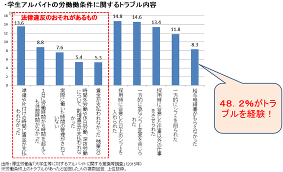 2015年の厚労省の調査では、アルバイトをしている学生の半分が色々な形で何らかのトラブルを経験したという結果になっています。
