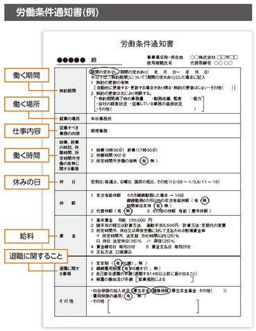 働く条件は、労働基準法上では書面で明示すると決まっています。働く期間、働く時間、休みの日、給料、辞める時はどうするなどの基本的なことは必ず文書でもらいましょう。たとえアルバイトであったとしても、働く期間が短かったとしても、どういう条件で働くかについては、必ず文書でもらうことが今の日本では当たり前ですので、皆さんももらうようにしてください。もらいにくいと思うかもしれませんが、もらわないと後でもめることになるかもしれません。人を雇う場合は必ず、どういう期間働いて、どの場所でどんな仕事をしてどういう休みなんだということは、口頭ではなくて文書で確認するというのが今の日本のルールなので、それはちゃんとやらなければなりません。
