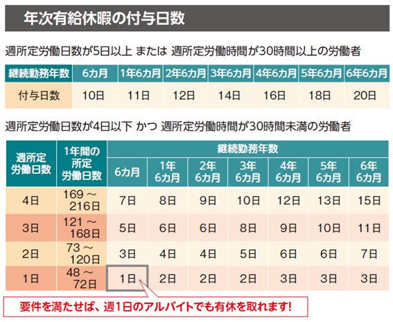 学生もパートもアルバイトもみんな、働く人たちなので、有給休暇を取ることができます。週の所定労働時間と週や年間の働いた日数によって付与される日数が決まっていますが、学生のアルバイトでも必ず有給休暇はあります。