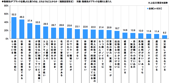 長時間労働が当たり前になっているとか、仕事に見合わない低賃金だとか。このように、色々なことで自分の企業をブラックだと思っているんだなと感じました。