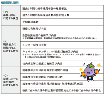 また、若者雇用促進法というものもあります。今、特に若い人たちが3年くらいで仕事を辞めてしまうという問題があり、若年層の雇用促進のためにこういう法律ができました。この法律により、企業は応募者から求められた場合は、以下の3類型ごとに1つ以上の職場情報を提供しなければならなくなりました。