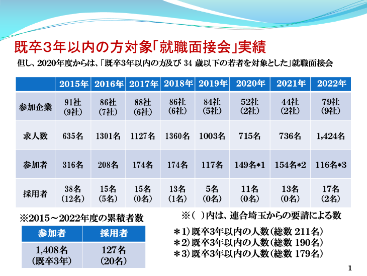 この表は、2015年から2022年までに実施した就職面接会の実績数値です。まず参加企業数を見ていただくと2019年度までは、概ね100社程度です。これは応募した企業ではありません。もっと多くの企業がエントリするんですが、会場の関係で大体100社までということもあって、抽選で選ばれた約100社の参加企業が出ております。ただ2020年以降、コロナ禍で半数の人数に絞られて、これも会場の関係で52社、44社と少なくなっております。昨年からコロナ禍でも行動制限がなくなった背景もあって、かつ会場のキャパシティとの関係で79社の参加企業で実施しております。ちなみに参加企業数のかっこ内にある会社数が、連合埼玉から加盟組織を通じて依頼して参加していただいた数になります。昨年は9社と多くの企業に連合埼玉経由で出ていただきました。2段目の求人数は、それぞれの参加企業から求められた求人数です。人数は、2015年から見ると2019年にかけてかなり増えていきました。ちょうど人材不足で、2019年頃までは非常に高まっていた時代です。2020年になってコロナ禍でかなり求人数は減少していった背景がございます。今年からコロナ禍でもかなり経済活動が活発化していく中で、1,400名。いわゆるafterコロナといいますか、出口戦略としてそれぞれの企業が採用を活性化、活発化しているのが数字からも見てとれます。この数字の中でもうひとつ触れなければいけないのは、2020年からは34歳以下の若者も対象にした人数だということです。それまでは既卒3年のみでした。今、国をあげて就職氷河期時代に就職できなかった方々を対象にした就職支援活動を行っております。だいたい年齢が35歳から55歳の方々を就職氷河期世代と呼んでおりますけれど、そういった方々に対しては取り組みをしている中で、34歳から既卒3年の間のゾーンが手薄ということもあって、34歳以下の若者に対象を広げて、取り組みを始めたのが2020年になります。参加者数は、2019年まで空前の人手不足ということもあって、既卒3年の方もどんどん減って行ったのがこの数字のあらわれです。ただコロナ禍になって求人が抑えられると今度は参加者数が増えて行ったというのも数字となって出ております。アスタリスクの1とか2とつけているのは、既卒3年の方の数字で、実際の総数は34歳以下の若者も含めると2020年は211人、2021年には190人、昨年は179人という数字になっております。最後に採用者数ですけれど、上の段が全体の採用者数、かっこの中が連合埼玉からお願いした企業の採用者数で、2022年度は2名の採用、全体で17名になります。左下に書いていますけれど2015年から2022年度の累積者数は127名で、採用数としては参加者数の割にはそう多くない数字かと思いますが、この数字は企業が採用しなかっただけではなくて、学生さんが辞退した数字も反映していますので、最終的に双方がマッチングした数字として127名になっております。そういった状況の中で、今現在でいえば非常に人手不足感がでてきているのが見えてきているところでもあります。
