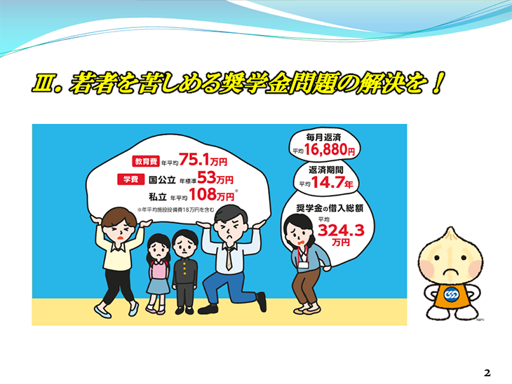 続いて若者を苦しめる奨学金問題の解決ということでお話しします。こちらに記載しているのは奨学金の負担実態を表した図になります。左側の家族で支えている絵は、各家庭が年間に負担している教育費の実態です。年間の平均で75.1万円の教育費を負担していることになります。また学費は国公立大学で53万円、私立大学で108万円の負担がのしかかっています。右のほうは就職して奨学金を返済している実態で、奨学金の借入額の平均が324万3,000円、毎月の返済額が16,880円、平均の返済年数は14.7年といった実態になっているということです。今の状況からいくと学生の二人に一人は奨学金を借りているのではないかともいわれています。