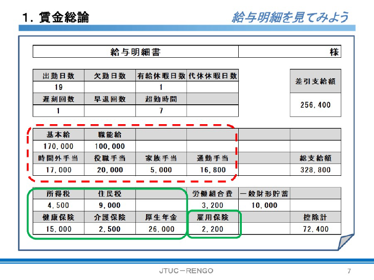 そのうえで賃金総論ということで本題に入ります。先ほど、賃金は労働の対価であり生活の糧であるとお伝えしましたが、まずは賃金について実際のイメージを持っていただいたほうがいいだろうと思いますので、少し簡素化した給与明細のひな型を示したスライドをご覧ください。みなさん卒業後働きだしたら毎月このようなかたちの給与明細をもらうことになると思います。また、みなさんのなかでアルバイトをされている方は多数いらっしゃると思いますので、すでに手に取っている方もいると思います。基本的に給与明細書というのはこういうものになるわけですが、赤い点線で囲っているグループと緑の実線で囲んでいるグループがあります。この赤い点線のグループはなんなのかというと、基本的に労働者が会社から受け取るものです。基本給からはじまって○○手当、××給、こういった名称で受け取るもので、ようは収入です。一方で緑の実線、これは支払うほうです。具体的には、所得税などの税金や、健康保険、雇用保険といった社会保険料です。そのうえで、この赤の点線と緑の実線の違い、それは赤い点線のほうは労働組合が会社に要求して交渉する、春季生活闘争、春闘などで交渉して勝ち取っていくものです。一方で緑の実線のほうは税金や社会保険料といった国の制度ですから、個別の労働組合が企業と交渉して何かを勝ち取ることは困難です。したがって、連合のような労働者の団体が国に対して、「この税金はこうすべき」といったかたちで政策要請なりをして対応していくものです。今日お話しするところは赤い点線の部分になります。