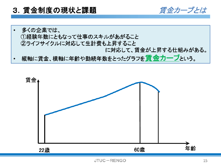 それでは賃金制度の現状と課題ということで、企業では具体的に賃金はどうなっているのかということに入っていきます。まず押さえていただきたい概念というのが、賃金カーブというものです。ここに書いてあるとおり、「多くの企業では」経験年数に伴って仕事のスキルが上がるということですとか、結婚をしたり子どもも産まれたりということでライフスタイルに対応して生計費も上昇することから、これらに対応して賃金が上昇する仕組みがあります。これが賃金カーブというもので縦軸に賃金、横軸に年齢を引いたうえでカーブを描くとだいたいこんな形になるというものです。入社してから右肩上がりになってどこかの時点でカーブが寝てくると、このイメージ図だと60歳でピークにしていますけれども、どこかの時点でカーブがなだらかになるというところです。これはご理解いただけると思うのですが、ひとつ重要な点がありまして、先ほど「多くの企業では」賃金カーブが制度としてあると言いましたが、裏を返すとすべての企業でこういうカーブがあるわけではないということなのです。特に、中小企業などでは賃金カーブが制度としてなくて、毎年社長の一存で賃金を上げるか上げないかみたいな形をとっているケースがままあります。また、仮に賃金カーブがあったとしても、今年は企業経営がしんどいから賃金カーブがあるけれども昇給はしないとか、そういったケースもあります。だからこそ労働組合は毎年、仮にこのカーブがあったとしてもまずはしっかりこのカーブどおりに賃金を上げていく、もしカーブがない場合はそもそも制度として賃金カーブを作るといったような要求、交渉を春季生活闘争、春闘でしているということなのです。