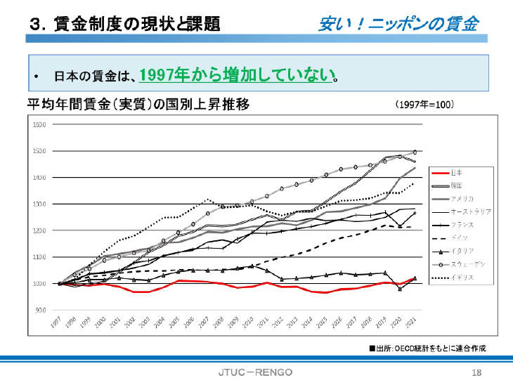 この30万7,400円という日本の賃金水準が国際的に見てどうなのか。この折れ線グラフは日本の賃金が一番高かった1997年を100としたうえで以降20年間のトレンドを国際比較で追ったものとなります。赤い線が日本ですが、20年来べたっと寝ているということが見て取っていただけると思います。イタリアも厳しい状況ではありますけれども、それ以外の国は右肩上がりです。もちろん各国物価も違いますし、そもそも1997年というのは日本の賃金が最高水準だったときですので、そこを100とするのはどうなのかという議論はあるかもしれません。ただ少なくとも日本の賃金はこの20数年間ずっと変わっていない。一方で諸外国は上がっている。こういった動きについてはぜひとも押さえておいていただきたいと思います。このように日本の賃金がずっと低迷してきた状況で実際何が起こったのかに話を移しましょう。