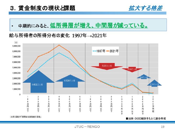 これは1997年と2021年の給与所得者の年収の分布を比較したグラフですが、左側の年収が低い層、100万円以下から500万円以下ぐらいのところまではオレンジの線のほうが青い線より上に来ていると思います。青い線というのは1997年の所得分布、オレンジの線が2021年所得分布ですから、賃金が高くない層が2021年には1997年より増えたということなのです。逆にオレンジの線が青い線より下に来ている、つまり人数が減っている層がありまして、それが真ん中の年収700万円台くらいから1,000万円くらいまでです。つまり、この約20年間で、いわゆる中間層は減っているということです。日本は分厚い中間層が経済を支えている国だとよく言われるのですが、現状は、この中間層自体がやせ細っているということなのです。これでは経済も回っていかないということでありますから、だからこそ賃上げをきちんとやって賃金を増やして中間層を増やしていくといった営みが必要であり、その賃上げを行うツールというかチャンスというものが春季生活闘争であるというところであります。