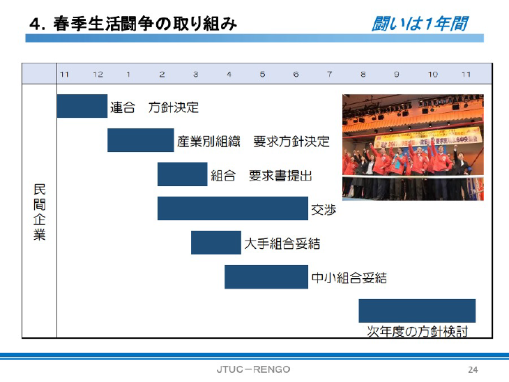 それは春季生活闘争はどのようなスケジュールで進めるのか。「労働組合は一年中春闘やってるよね」と言われることが結構ありますが、実はそれはあながち間違っていません。スライドを見ていただくとおわかりのとおり、ほとんど切れ目なく棒グラフが伸びていると思います。具体的には、まず年末に連合が「来年このくらい賃上げする」という春季生活闘争の方針を決めます。その後に、産業別の組織、具体的には自動車産業や電機産業とか電力産業の労働組合が集まっている産業別組織が、「それではうちの産業ではこのくらい賃上げしよう」といった産業ごとの春季生活闘争の方針を決めます。それがちょうど今の1月~2月の時期になります。その後、それぞれの産業別組織に属している個別企業の労働組合が、「それでは、うちの会社ではこのくらいの賃上げを求めよう」といった要求を考える。これが2月で、その後2月から3月にかけて会社に要求書を提出し、交渉がスタートします。その後は、大手の組合はだいたい3月で春季生活闘争は妥結、終了していくわけなのですが、中小ではやはり大手の結果を見てからの交渉というのが結構あります。したがって、実際に妥結するのが5月6月になるというケースが少なくありません。そうしたうえでだいたい6月くらいに概ね結果が出揃いますが、今度は、また8月くらいから来年度の賃上げの方針をどうするのかという議論が始まっています。これらを踏まえると「労働組合は一年中春闘やっているよね」というのはおおむねその通りなのだろうと思います。