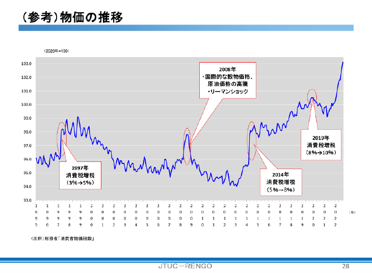 それではこの5%の賃上げというのは、どういった水準なのか。このグラフが過去の賃上げの実績です。これ見ていただくと大昔は5%を超えて6%に迫る賃上げを行うことができた時期もありましたが、ここ最近の賃上げ率は2%前後で推移しています。そうした事実を踏まえると今年の春季生活闘争の連合の要求である5%程度の賃上げの実現はハードルが高いとも認識しています。ただ、最近の物価上昇も含めて考えるとしっかりと取り組まなければならない、今年はそういった年です。その物価について少し見ていきたいと思います。