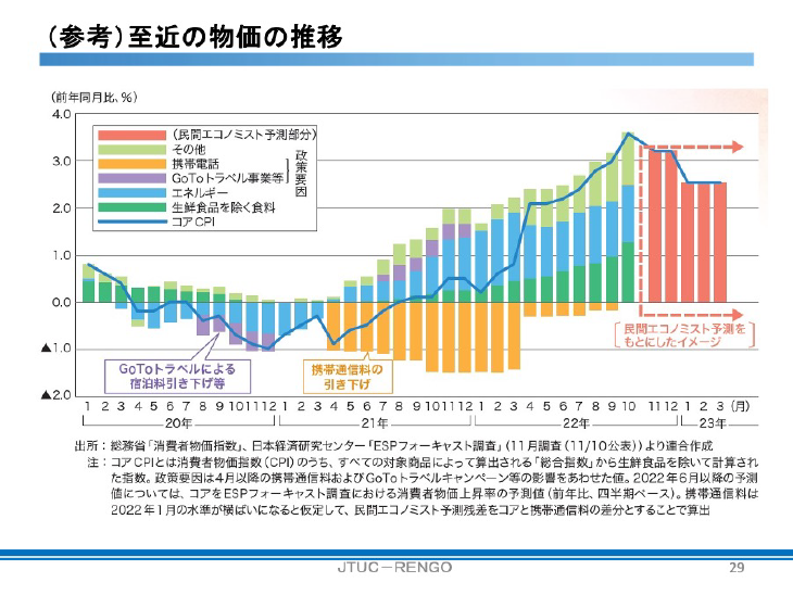これをもう少し直近に引き直したものが、至近の物価推移というスライドです。直近のものにフォーカスすると、折れ線グラフの消費者物価(コアCPI)が2022年に入ってからはぐっと上がっています。特に最近では3%台後半で推移していますが、その動きを棒グラフで要因別に分解をすると、やっぱりブルーの棒グラフ部分、すなわちエネルギー価格、電気料金やガス料金の上げ幅がかなり効いているのです。また、濃い緑の棒グラフ部分の食料品などの部分も結構上がっている。そしてもう1つ、オレンジの棒グラフで2021年代に下方に伸びている携帯通信料の引き下げです。これは当時の菅総理が携帯通信料引き下げを掲げて実施されたことによってかなり物価にはマイナスに寄与していたわけですが、この影響が2022年に入ってから縮小したということで、これも2022年以降の影の物価押し上げ要因になっているのです。具体的にはオレンジの棒グラフが下に出ている部分がマイナス1%くらい2021年代はあったわけですが、これが消えたので2022年後半には物価がどんと上がってきているのです。物価が上がっても賃金が上がらないと労働者の生活は非常に苦しくなるわけですから、こういった面からも2023春季生活闘争はしっかり賃上げを獲得していかなければならないのです。