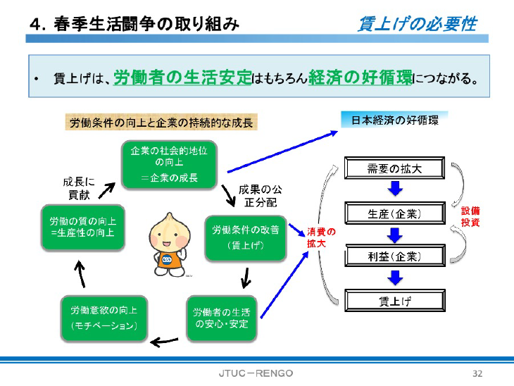 それではこうした賃上げが最終的にどのような未来をもたらすのか。賃上げというと、ややもすると労働者の生活の安定というか生活保障の面だけが強調されます。もちろんそれは絶対に間違いではないのですが、それだけではないのです。つまり、賃上げによって労働者の生活が安定すれば労働、働く意欲が向上して、生産性も上がってそのことによって企業が成長する。企業が成長するとまた賃上げにつながる。こうした好循環をまわしていくことが賃上げの重要な点であろうと思っています。