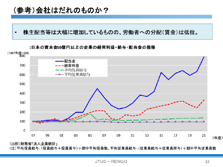 一方でこういったことをあまり理解していただけない経営者もいて、会社は経営者、株主だけのものだという方がいらっしゃいます。企業の生産性が上がって利益が出たのなら株式会社でいえば出資者である株主に還元すべきだという考え方です。私も冒頭自己紹介で申し上げましたけれども、証券取引所、マーケットにいましたのでそれはその通りと思う面もあります。ただやはりそれだけでないと思うのです。すなわち、企業は働く人がいて初めて成り立つもので、働く人ひとりひとりには家族があったり生活があったりするわけです。そういった事情を考えればこそ、企業の責任として労働者への分配をしていく、これが必要だと思います。グラフを見ていただければと思いますが、青い線の株主への配当金はこの20年間で大幅に増えています。一方で労働者への分配はひどいもので、この紫の四角の二重線のグラフですが、いっこうに上がっていない。日本の賃金はずっと横ばいで、結果として中間層の収縮を招いてきたのです。この状況を変えて明るい未来を作っていくためには賃上げが必要であり、そのためにも2023春季生活闘争が重要だということで、私のお話の締めくくりとしたいと思います。