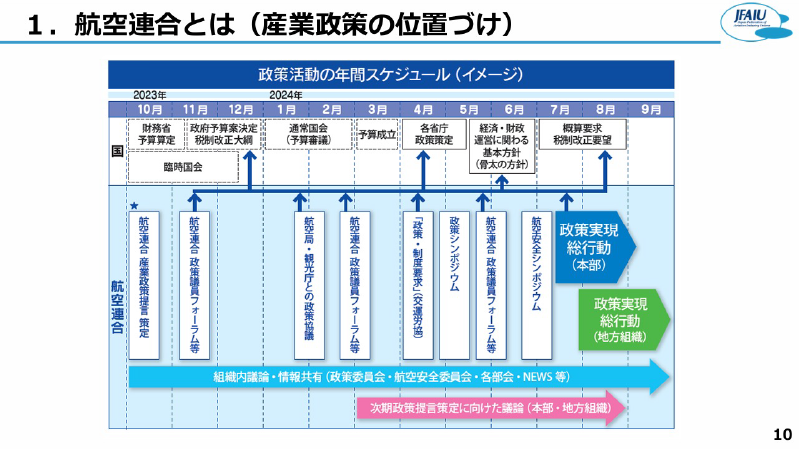 航空連合は10月から1年間がスタートするので、こうした国の予算審議や法律の議論といったスケジュール、国会の動き、そうしたこととあわせて我々自身もいろいろと情報収集したり関係各所にお願いしに行ったりと、そうしたことに取り組んでいるスケジュールになります。1年間かけて職場の声を集めてやっています。