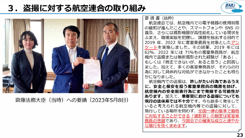 この法律が制定されるにあたって今は経済産業大臣になられている斉藤法務大臣に要請に行きました。客室乗務員出身の赤池さんの前任の皆川さんと私で一緒に要請をしました。これは渡した要請書の内容の抜粋になります。政策づくりの本質ということでぜひ、後で読んでいただけたらと思います。我々も自信を持って書いているけれども100点満点かどうかはいろいろご意見があるかもしれないので、いただければと思います。先ほどお配りした青い産業政策提言の冊子に書いてある内容をベースに、大臣などに要請するにあたって我々としては政策をこういうふうに要請書としてしたためるわけですけれど、内容に不整合がないかすごく大事にします。私たちは良くてもほかの人たちは問題があるようなことはないかは当然チェックもするし、主張の妥当性、それが世に受け入れられる内容なのかどうかを含めて見ます。一番わかりやすいところでは、自分たちのエゴとかわがままだけじゃなくて社会的に認められるような内容になっているのかは、文章も含めてかなり真剣に検討したうえでこうしたものを当然政府にも要請をします。特に私たちがこころがけているのは、労働組合なので、職場の声、職場の実態をしっかり伝えるようにアンケートの結果なども少し引用して、政府にも要請をしました。撮影罪を早く成立してほしい、都道府県の条例では航空機内の盗撮を取り締まることができません、ということです。