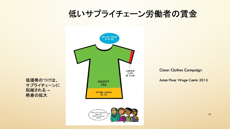 これもちょっと古いデータですが、そんなにはパーセント変わらないと思います。例えばみなさんが着ているTシャツで、バングラデシュなどの縫製労働者が実際のTシャツの代金の何パーセントを賃金としてもらっているか、NGOが調査したら約3%しか賃金支払われていない。ということは、食うや食わずのリビングウエイジも払わないバングラデシュの経営者はもうちょっと払ったって本来いけるはずなんです。ただ彼らもなかなか発注者に高い料金を請求できないという問題がここに潜んでいます。だからここで労務費が非常に少ないという問題があります。
