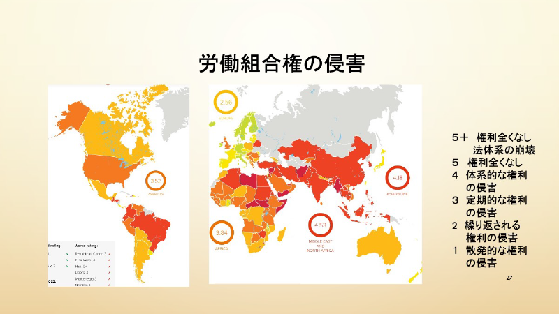 世界で労働組合権はどんな状況かというと真っ赤っ赤ですよね。真っ赤のところは、労働組合権がかなり侵害されていることを示しています。これで見ると多くの国で侵害されていることが分かります。例えば中米でも人が多く殺されて問題ですし、アジアも真っ赤っ赤、そういう状況になっています。最悪の十か国としては、アジアからはバングラデシュ、それからミャンマー、フィリピンが入っています。アジアでもストライキ権がなんらかの形で侵害されているのが87%。つまりストライキは簡単にうてないことになっています。結社の自由、組合をつくるのも87%で侵害がある。つまり組合を作ったり交渉したりするのは、自由にできないということになります。じゃあそういう中で私たちは何ができるかということなんですが、国際レベルでは私も理事をさせていただいているILOで、労働基本権に関する条約を決めて、順守を促しています。ただし、例えばバングラデシュみたいに条約は批准したものの、守っていない国がある。そうするとILOとしても指導や技術協力を通して、法律や規則を改正させたりしています。さらに、それを実施させる指導もしています。今ILOの年に2回ある理事会のたびに、バングラデシュ政府はここまで状況を改善しましたという説明をすることになっています。そのたびに労働者側からまだまだ全然だめということでコメントを出していますが、このように労働基本権を守らせる機関として国際的にはILOが存在しています。
