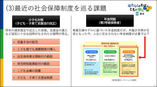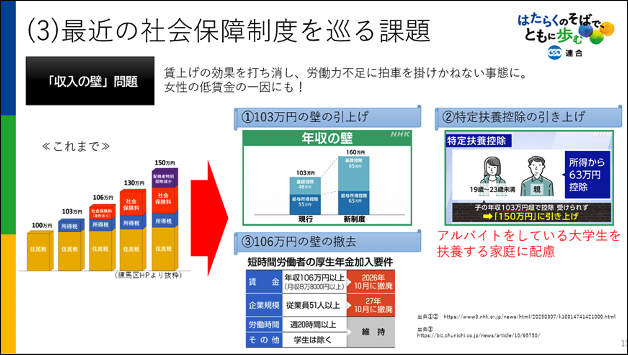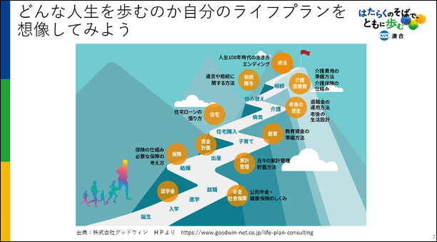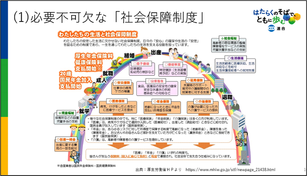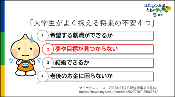 まずは、「夢や目標が見つからない?」ということについて、皆さんはどうですか、ということを聞きたいと思います。それから、職業人生のスタートにあたって、皆さんがどう考えるか。具体的には、生きていく中でライフイベントに応じて、世の中には色々なセーフティネットがあります。社会保障制度などと言われますが、そういったセーフティネットについて、連合はどのように考えているのかということです。次に、社会保障にはお金がかかりますから、税金との関係ですね。そして、最近の社会保障制度をめぐる課題ということで、皆さんも年金とか収入の壁とかですね、いろいろなことをマスコミなどから耳にすることがあると思いますし、選挙でそのことが問われたりしています。ついこの間の3月31日には、今年度2025年度の115兆円にものぼる国家予算が決まりました。どのような税制(税金)の体制をとるか、そういう最近の社会保障制度をめぐる課題、そして、連合が何をめざして、どういう社会を作ろうとしているのか、について順番にお話ししていきたいと思います。