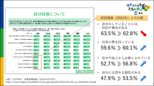 日本財団が、18歳の方に、毎年同じ質問で意識調査をしており、日本をはじめ、アメリカ、イギリス、中国、韓国、インド、計6カ国を対象として質問を行っています。残念ながら、1項目を除いて、日本で取られたアンケート調査の結果は、日本が最下位ですね。残念ながら、そういう状況です。