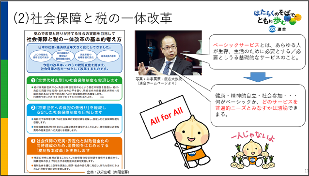 では、そういう社会保障をやっていくのに、どうやって税金を取るのかということです。皆さんにも関係があることですから、一緒に考えてほしいと思います。連合では、慶応義塾大学の井出先生と一緒に、社会保障と税の一体改革ということで、少なくともベーシックサービスについては、全部、国が持つべきではないかという考え方を出しました。ベーシックサービスというのは、医療、子育て、教育、それから、介護、障がい者関係、そういったものは一切負担をゼロにする。全部、国負担でやろうということです。連合も高等教育までの無償化と言っています。